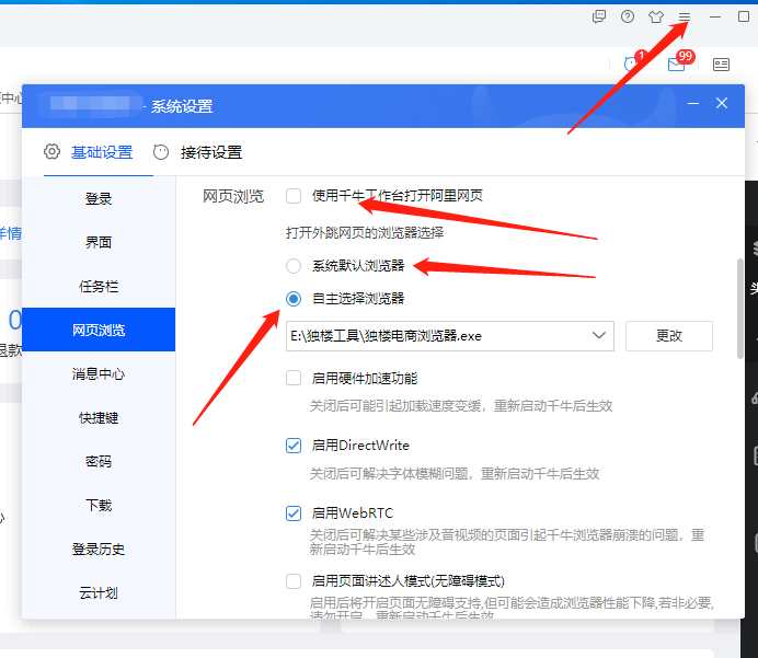 点击网页浏览 取消勾选 使用千牛工作台打开阿里网页 选中自主选择浏览器 然后选择本软件程序就可以