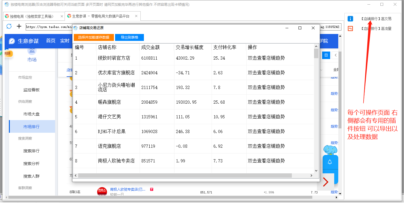 4.点击浏览器下方的箭头可以调出和隐藏插件列表 每个页面有专用的插件按钮 点击可以导出和处理数据